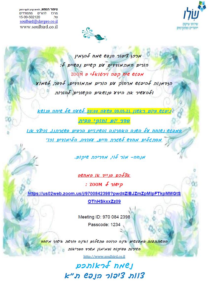 הורים יקרים, צוות ציפור הנפש מזמין אתכם, לקחת חלק במפגשים המיועדים להורים המתמודדים עם בעיות נפשיות. זוהי הזדמנות להכיר הורים מתמודדים נוספים, לשתף, להתלבט ולקבל הכוונה בנושא הורות, משפחה ובכלל,
