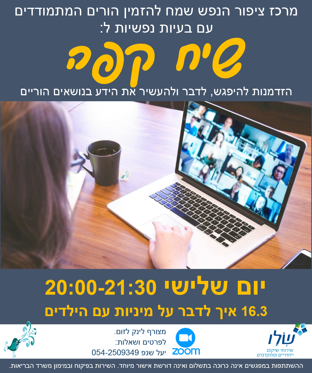 ZOOMהורים יקרים, צוות ציפור הנפש מזמין אתכם, לקחת חלק במפגשים המיועדים להורים המתמודדים עם בעיות נפשיות. זוהי הזדמנות להכיר הורים מתמודדים נוספים, לשתף, להתלבט ולקבל הכוונה בנושא הורות, משפחה ובכלל, וכל זאת באווירה אינטימית וחווייתית מהסלון שלכם. המפגשים יתקיימו בימי שלישי, אחת לשבוע, נפגש בזום, בשעה 20:00-21:30 ההשתתפות במפגשים אינה כרוכה בתשלום או באישור מיוחד.